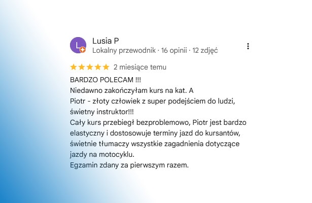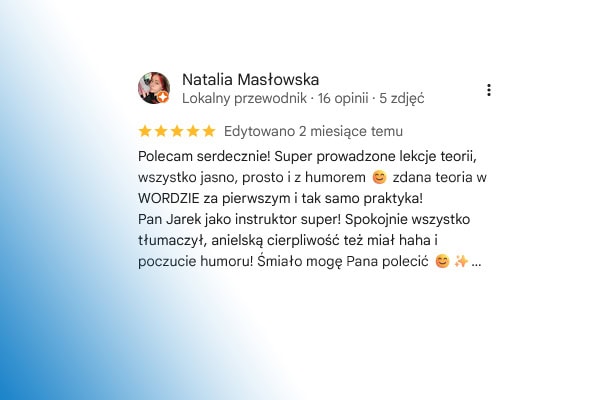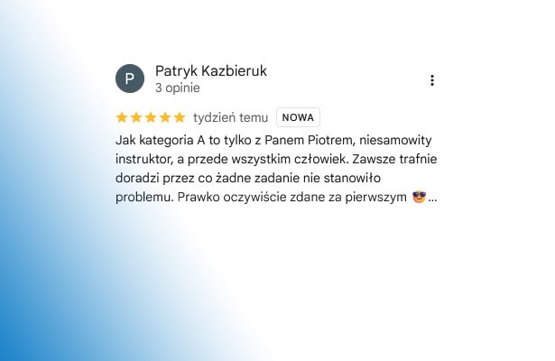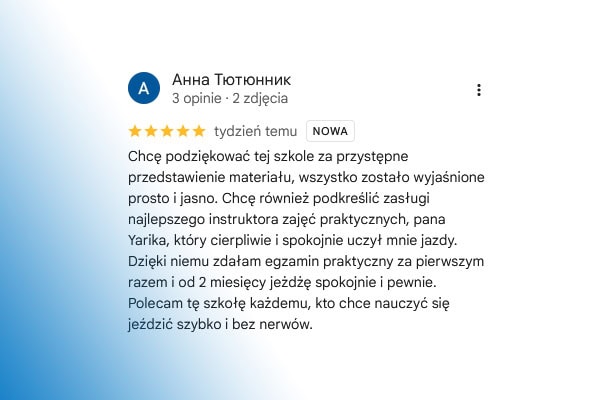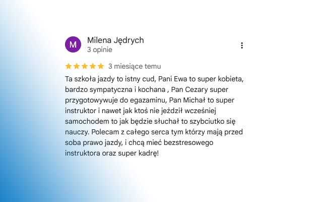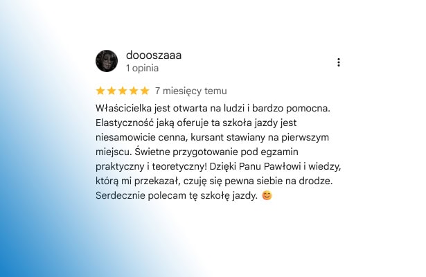 Opinie naszych kursantów najlepiej pokazują, że nauka jazdy w Raszynie z Auto-Kursy u Jankowskich to pewna droga do zdania egzaminu i zdobycia prawa jazdy. Kursanci chwalą profesjonalizm instruktorów, przyjazną atmosferę oraz to, że potrafimy dostosować tempo nauki do indywidualnych potrzeb.