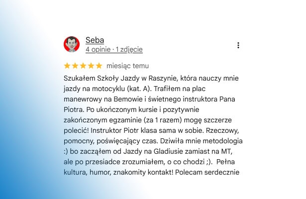 Nasza szkoła jazdy w Raszynie cieszy się ogromnym zaufaniem kursantów. Do tej pory zebraliśmy już 136 opinii w Google Maps, a średnia ocena wynosi imponujące 4,8/5. Tak wysoka nota potwierdza, że kursanci doceniają nasze indywidualne podejście, cierpliwość instruktorów i skuteczność w przygotowaniu do egzaminu.